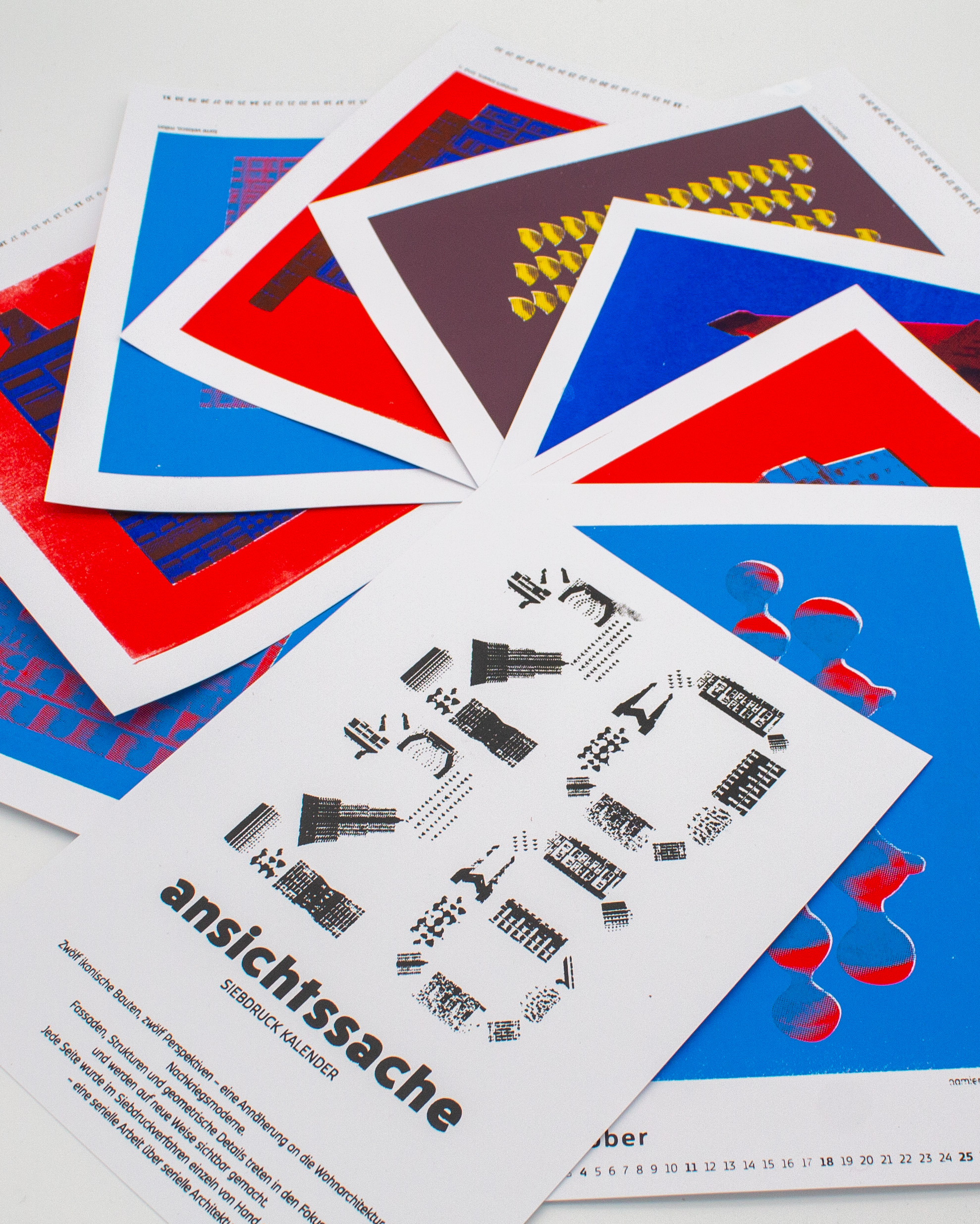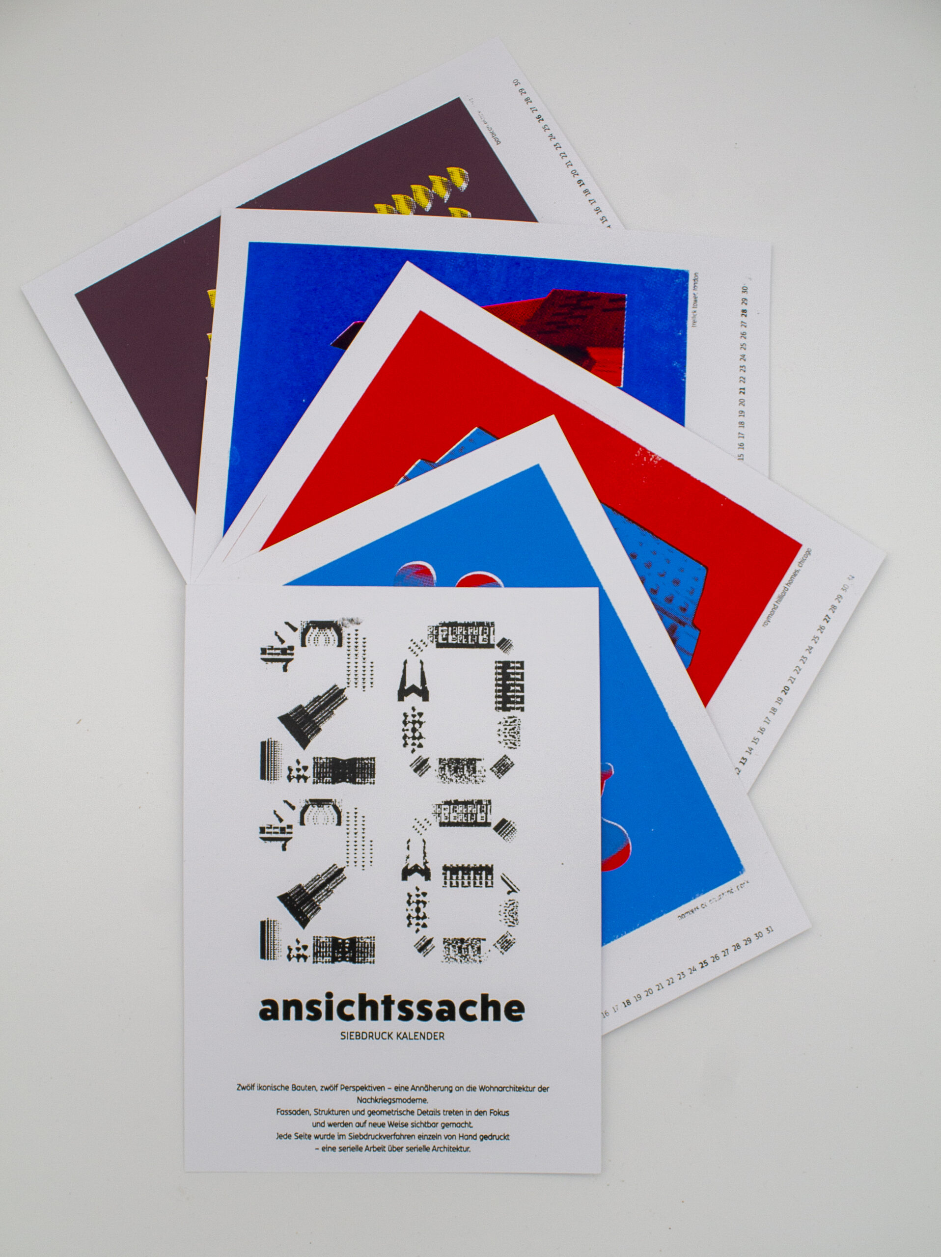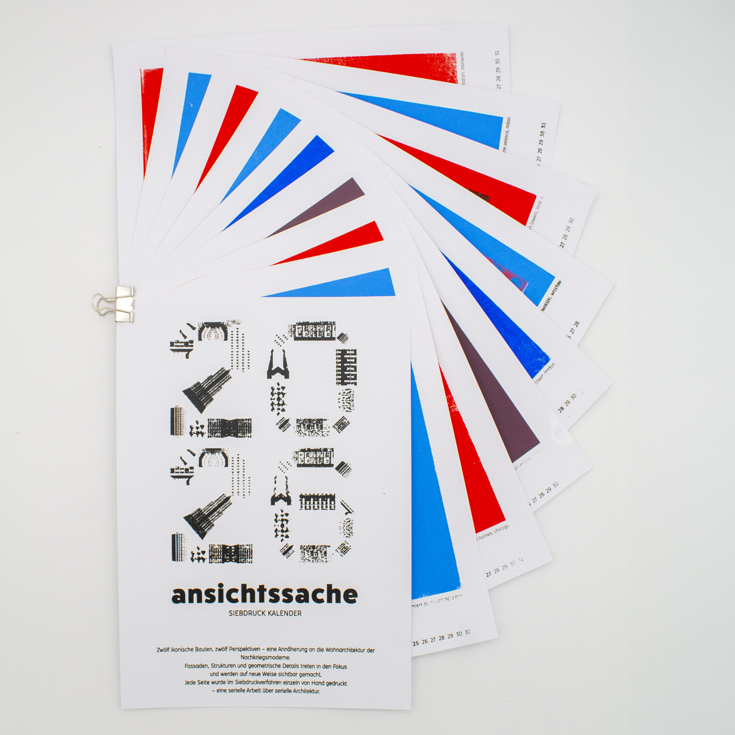 Zwölf ikonische Bauten, zwölf Perspektiven auf die Wohnarchitektur der Nachkriegsmoderne. Fassaden, Strukturen und geometrische Details werden in den Fokus gerückt und neu sichtbar gemacht. Jede Seite wurde im Siebdruckverfahren von Hand gedruckt – eine serielle Arbeit über serielle Architektur.