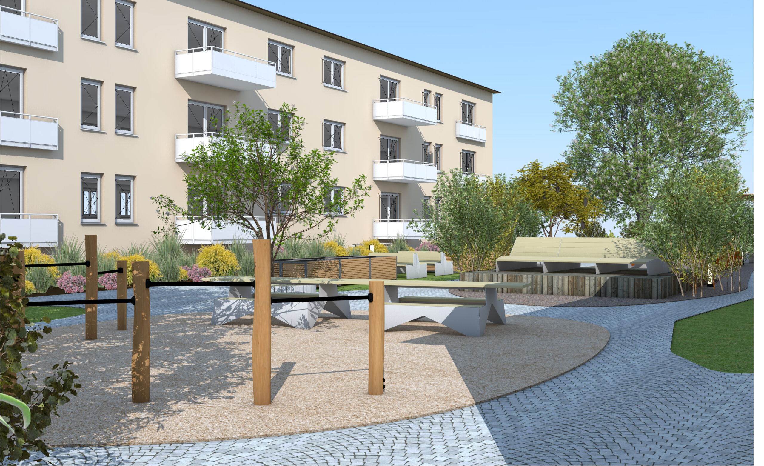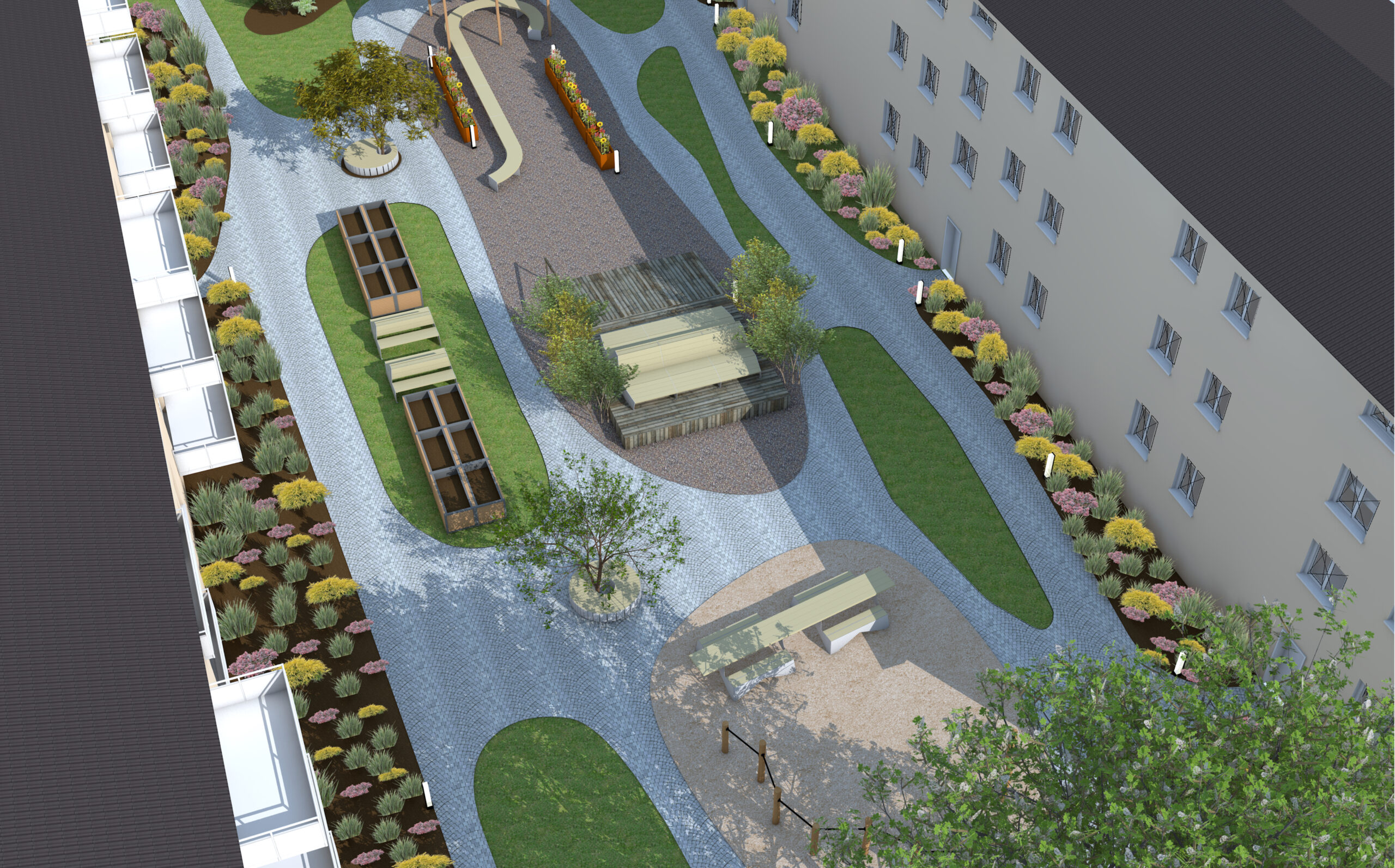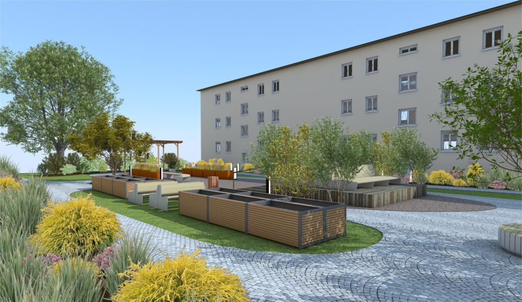 Aus einer ungenutzten Grünfläche entsteht ein lebendiger Treffpunkt für die Nachbarschaft. Sitzgruppen und offene Bereiche laden zum Verweilen und Austausch ein, während Beete nicht nur Grünraum schaffen, sondern auch Privatsphäre bieten. Hochbeete fördern gemeinsames Gärtnern und der multifunktionale Spiel- und Bewegungsbereich integriert Spielspaß und sportliche Aktivitäten. Der Garten verbindet praktische Funktionen mit einer einladenden Atmosphäre und schafft Raum für Erholung, Begegnung und Gemeinschaft.